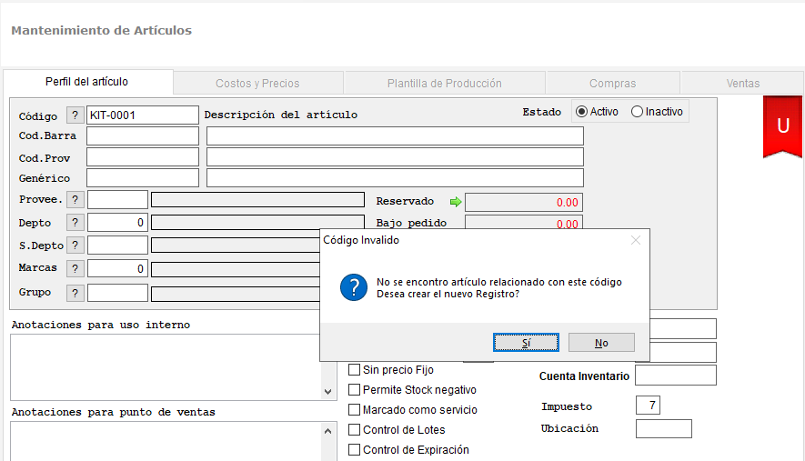 Creamos el nuevo código del producto final o producto terminado y le ingresamos toda la información correspondiente.